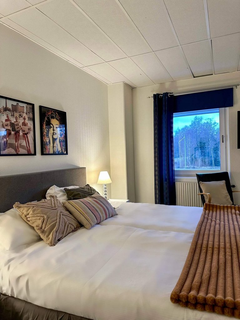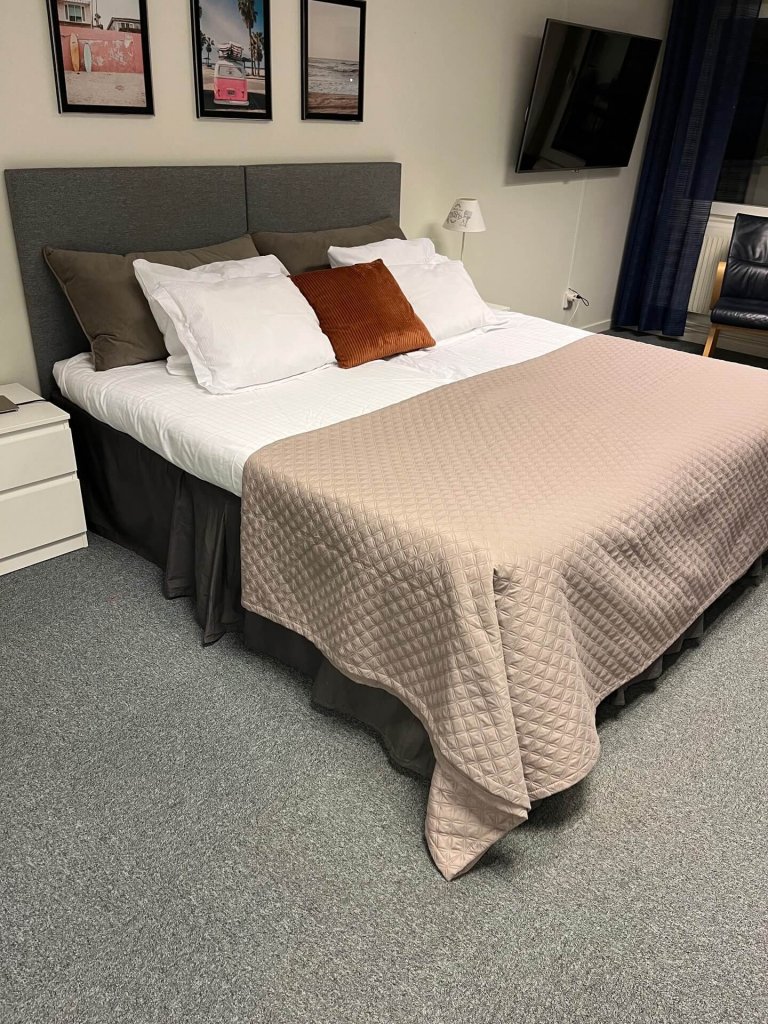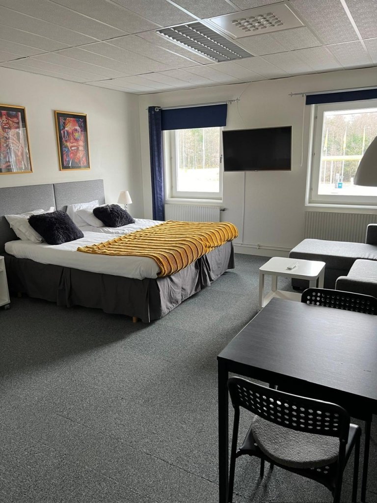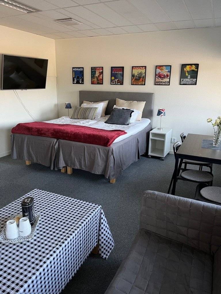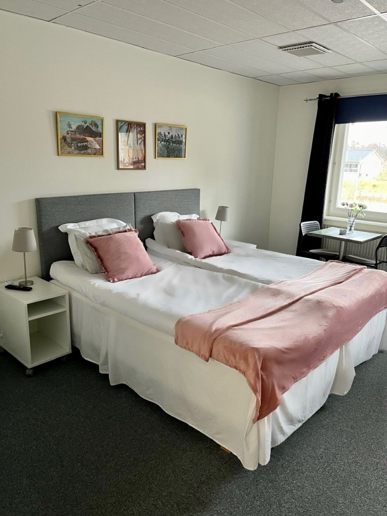 Hos oss bor du prisvärt i stora rymliga rum utrustade med stor platt-TV, gratis WiFi, micro, vattenkokare och kylskåp. Alla våra rum har eget badrum med toalett och dusch, sänglinne och handdukar ingår i priset. I hotellkorridoren finns ett vitrinskåp med glas, tallrikar, bestick m m som ni kan hämta efter behov. Alla rummen har en liten matplats med bord och stolar.